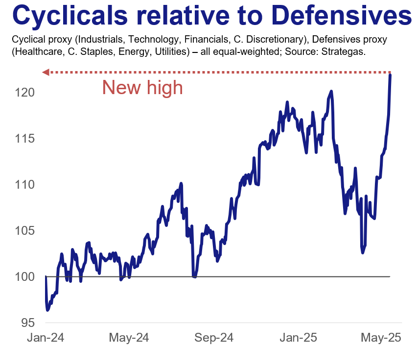 Leadership. On the leadership front, the market has also reclaimed a more pro-cyclical bias ‒ the renewed relative vigor from the Industrials sector is the most overt example, while our equally weighted Cyclical vs. Defensive pair made a fresh high this week.