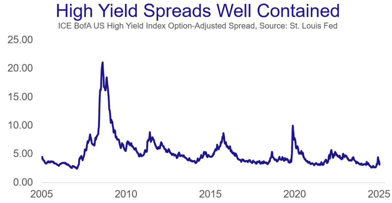 Inflation. The 2022 wave of U.S. inflation now appears to be over (inflation expectations still look anchored). But per our research, history suggests that once inflation gets going, a second wave tends to build over the next several years (87% of the time globally). We’re in the lull between waves thus far in 2025. Supply chain problems due to trade disruptions could create significant upward pressure on prices in the near-term, however.