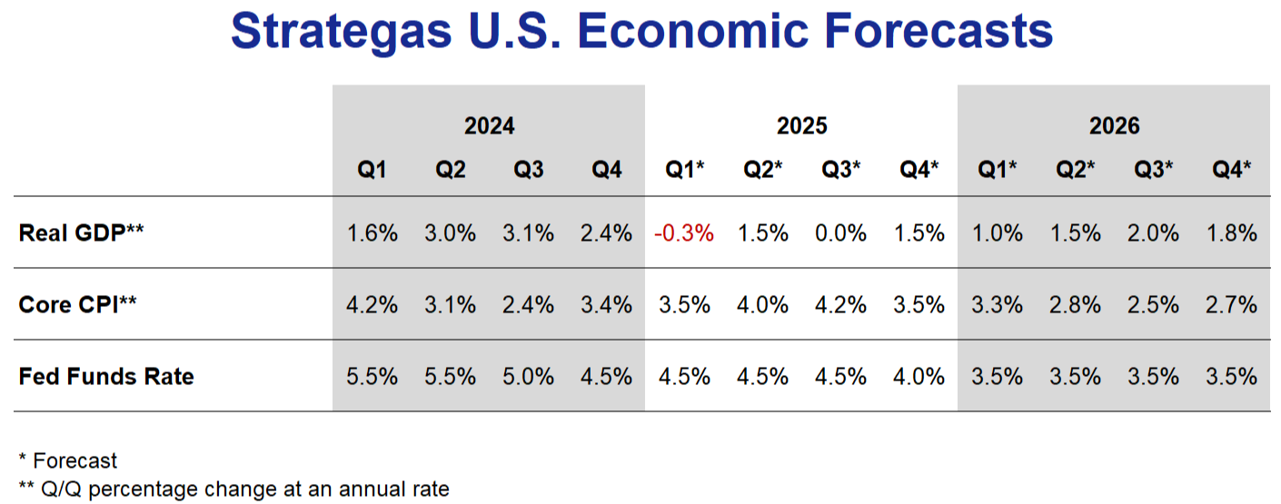 • Strategas earnings estimates are lower than Wall Street consensus, but we are still expecting growth of +4% in 2025 (for an S&P 500 earnings per share figure of $255)
