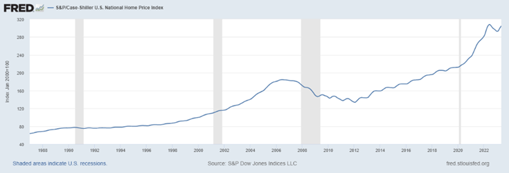 Property values have generally followed an upward trajectory. Source: The Federal Reserve Bank of St. Louis.